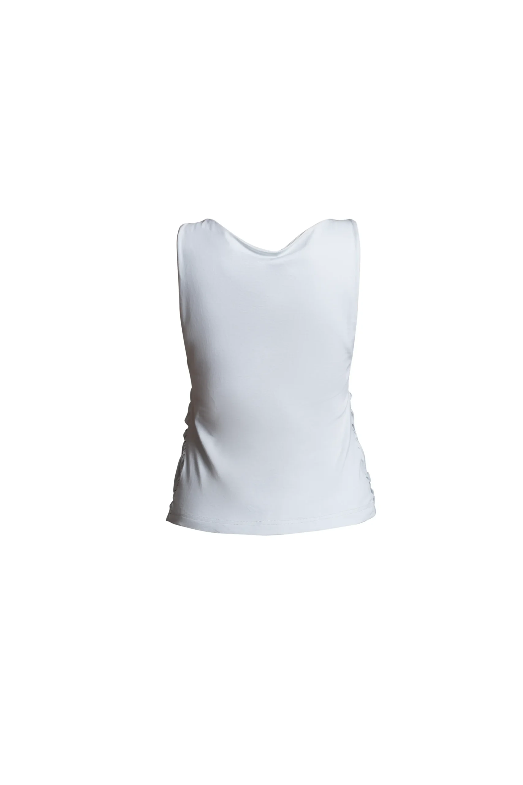 Esta blusa destaca por su diseño con una técnica de recogido en los costados y un corte asimétrico que realza la figura. Su confección en tela jersey 100% algodón la hace cómoda y fresca, sin perder el toque sofisticado, ideal para cualquier ocasión.