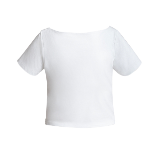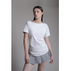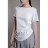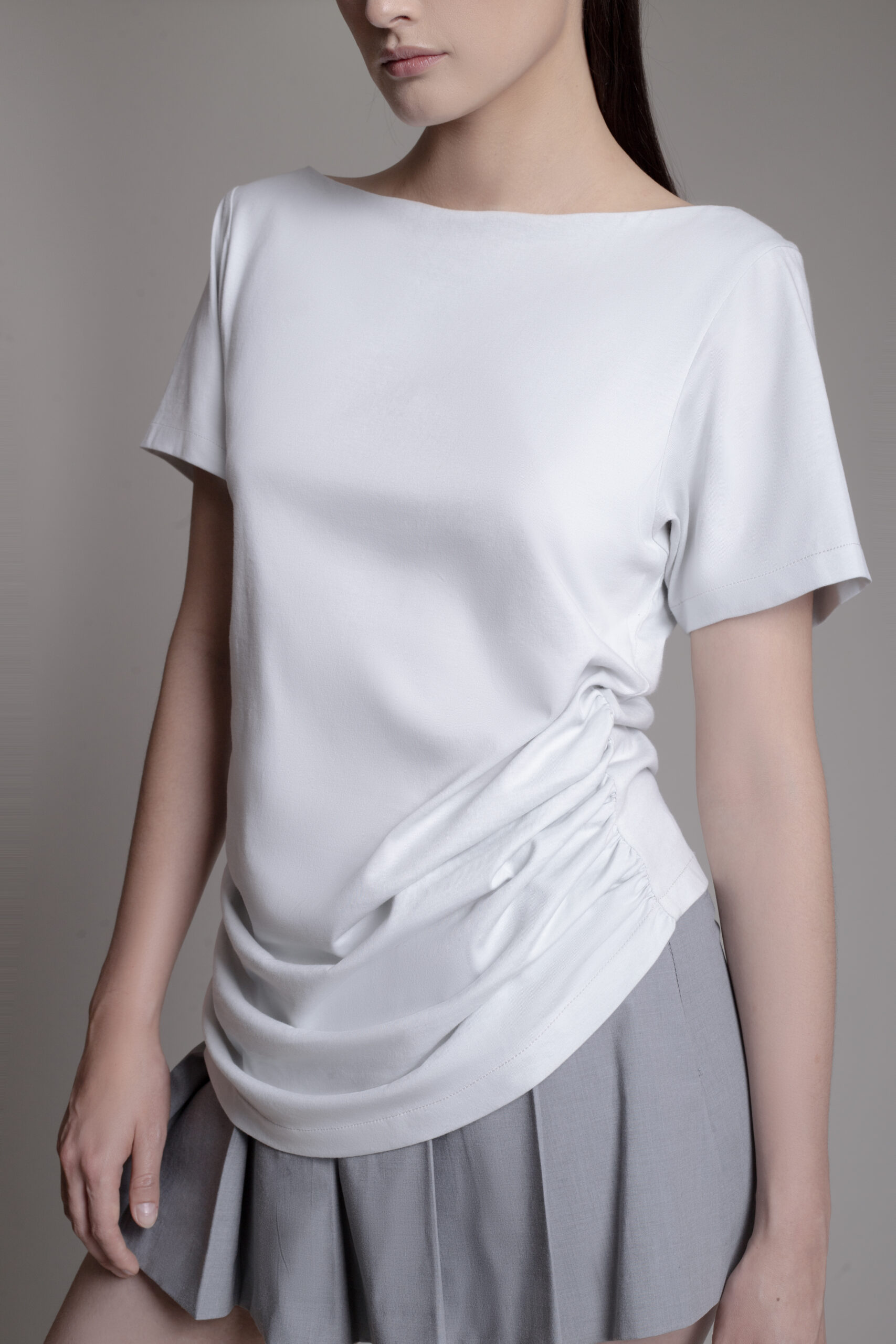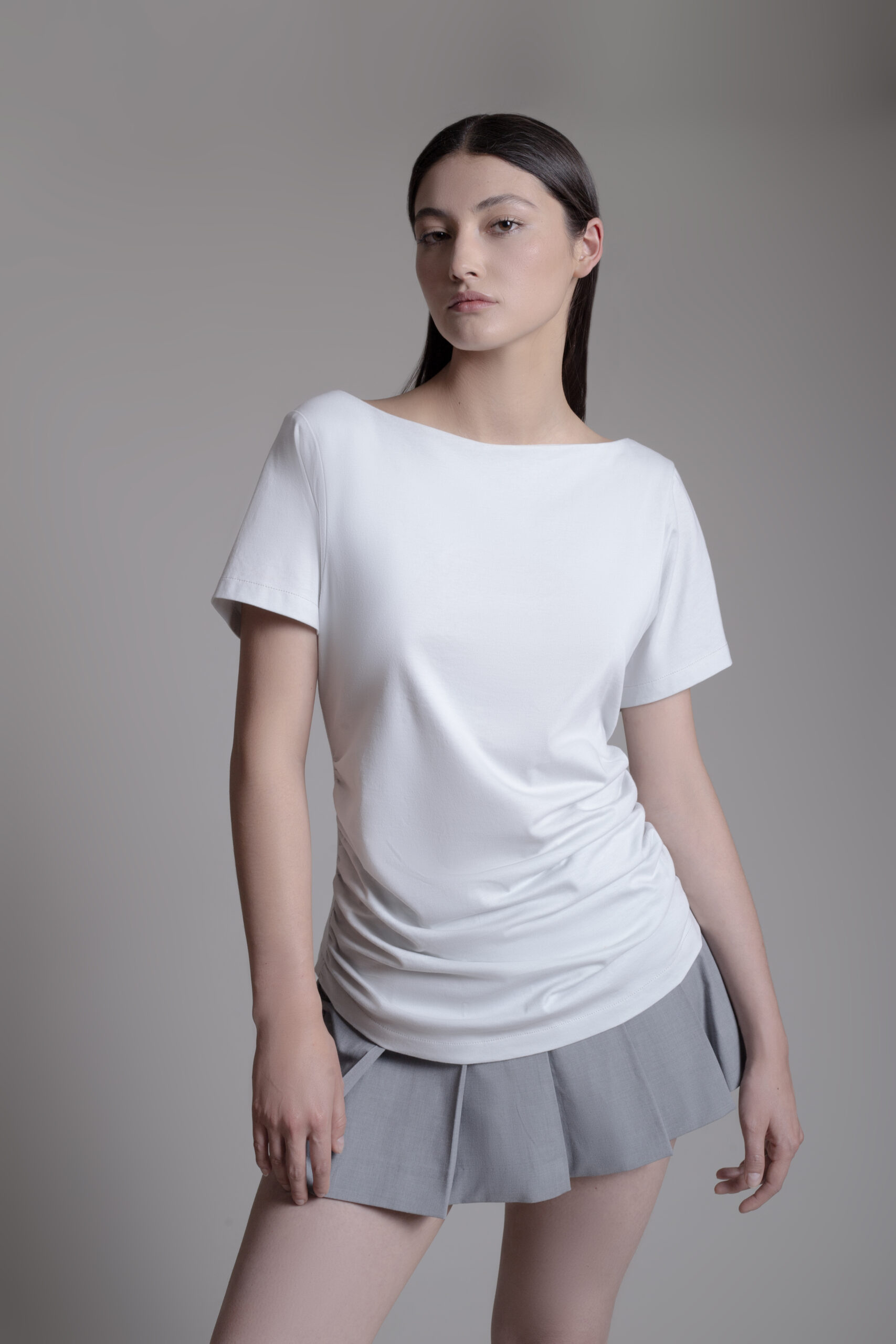 Blusa de diseño fresco y juvenil con un delicado recogido en los costados y un cuello bandeja que resalta los hombros. Las mangas cortas y la tela jersey buda de 100% algodón la hacen perfecta para un día soleado, brindando comodidad y estilo.
