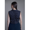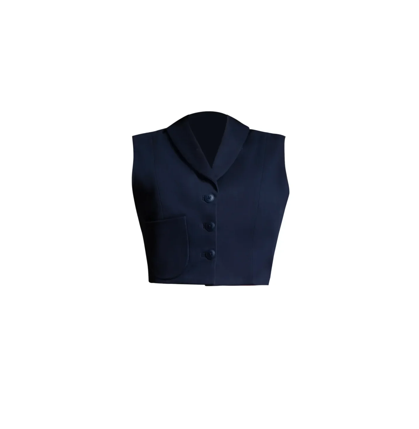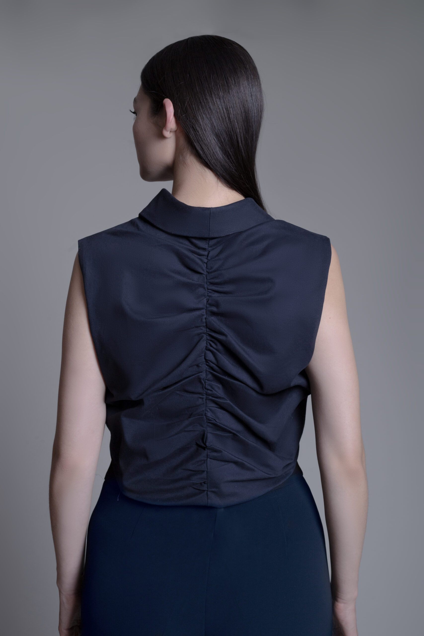 El chaleco, confeccionado en dril, destaca por su diseño único con un recogido en la espalda, que añade un toque de sofisticación. Versátil y cómodo, es una prenda atemporal que puede adaptarse tanto a un estilo formal como a uno más osado, ofreciendo flexibilidad para cualquier ocasión.